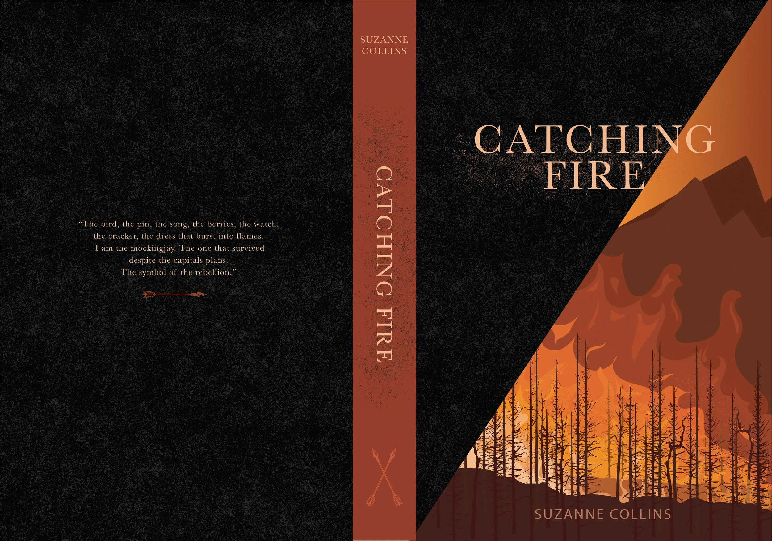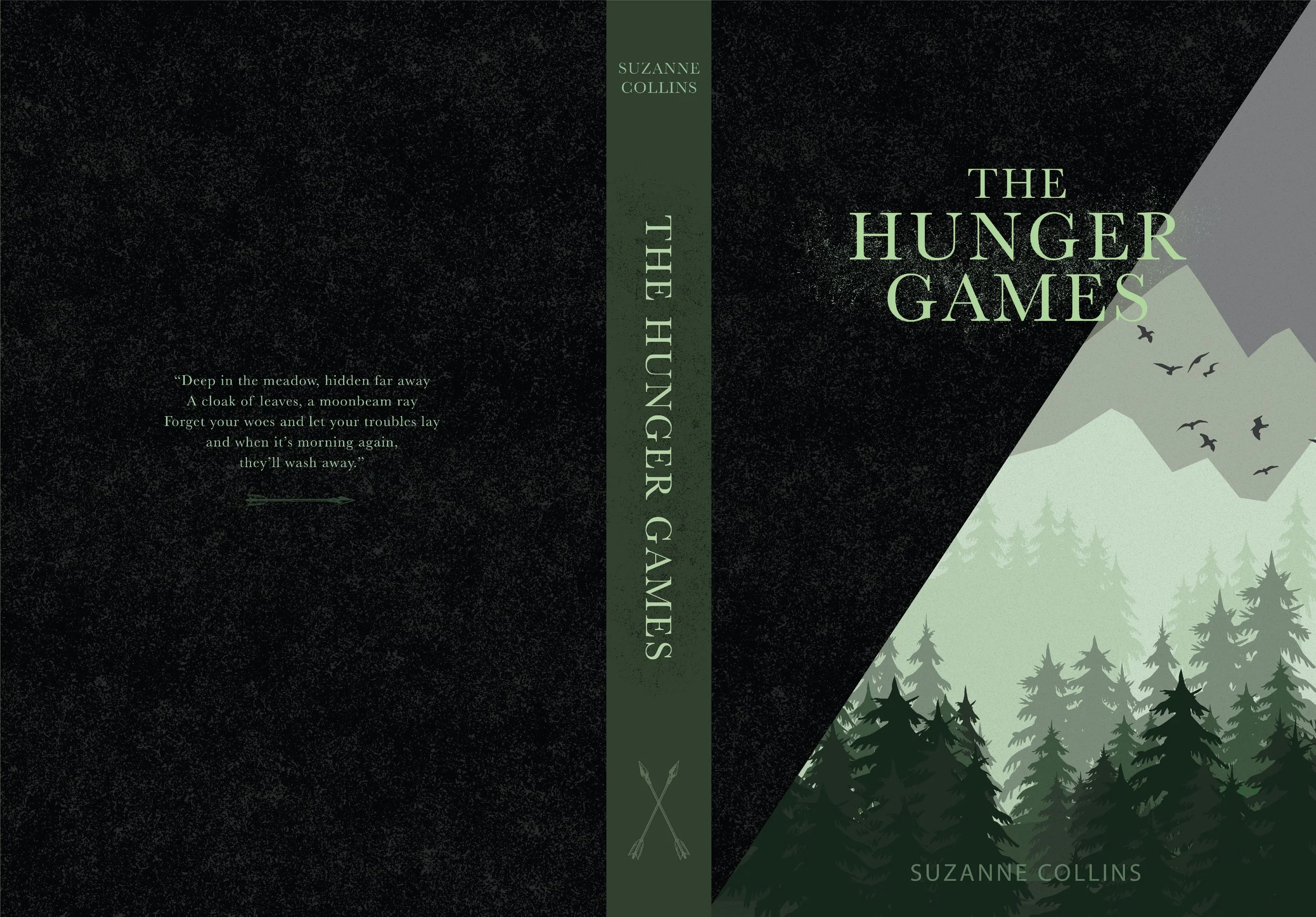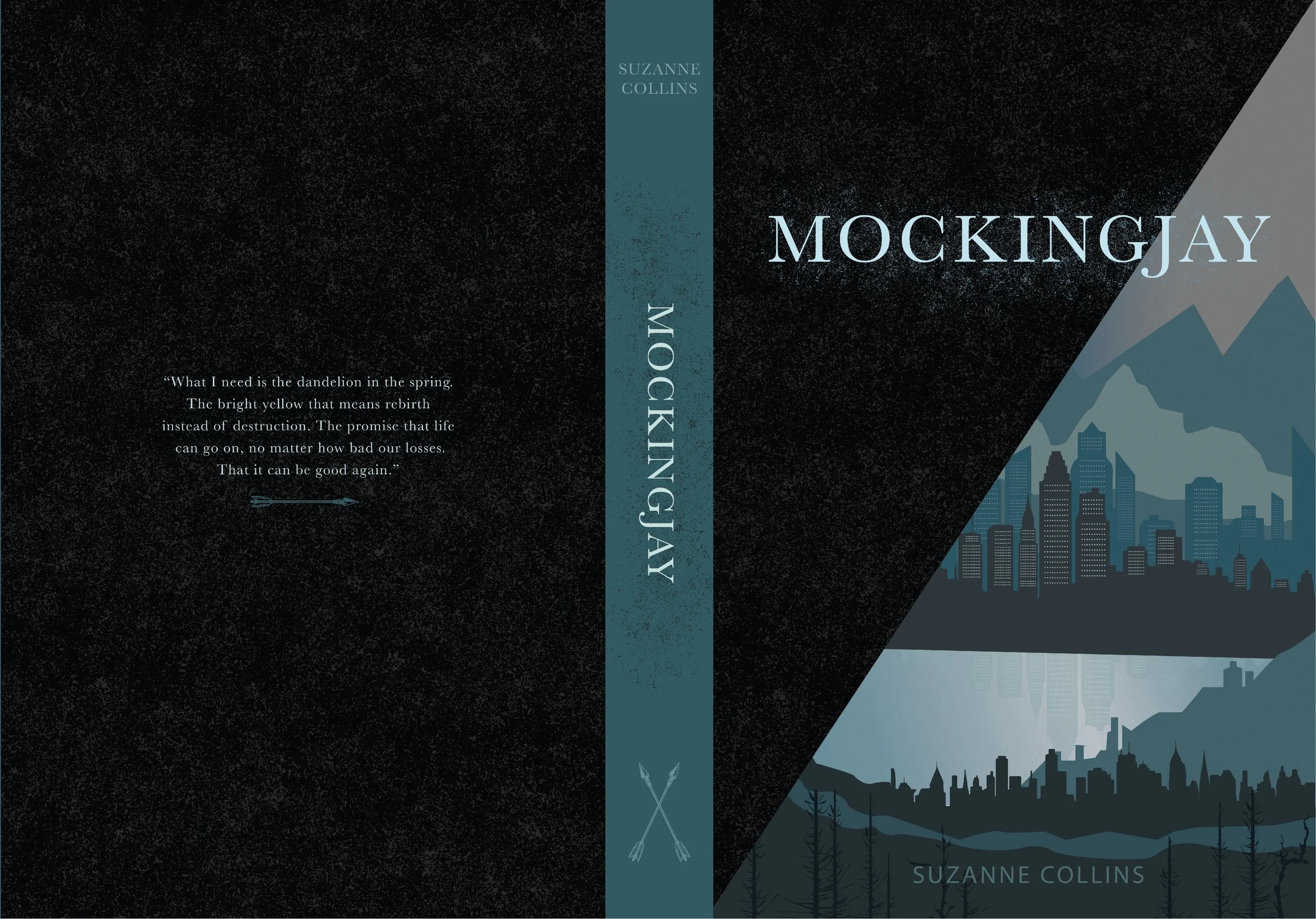 Cover illustrations for the Hunger Games Trilogy by Suzanne Collins. Created using minimal representation with flat, 2D, landscape illustrations. Use of desaturated monochromatic palette and geometric shapes. Symbolically representing the dystopian novels plot and setting.